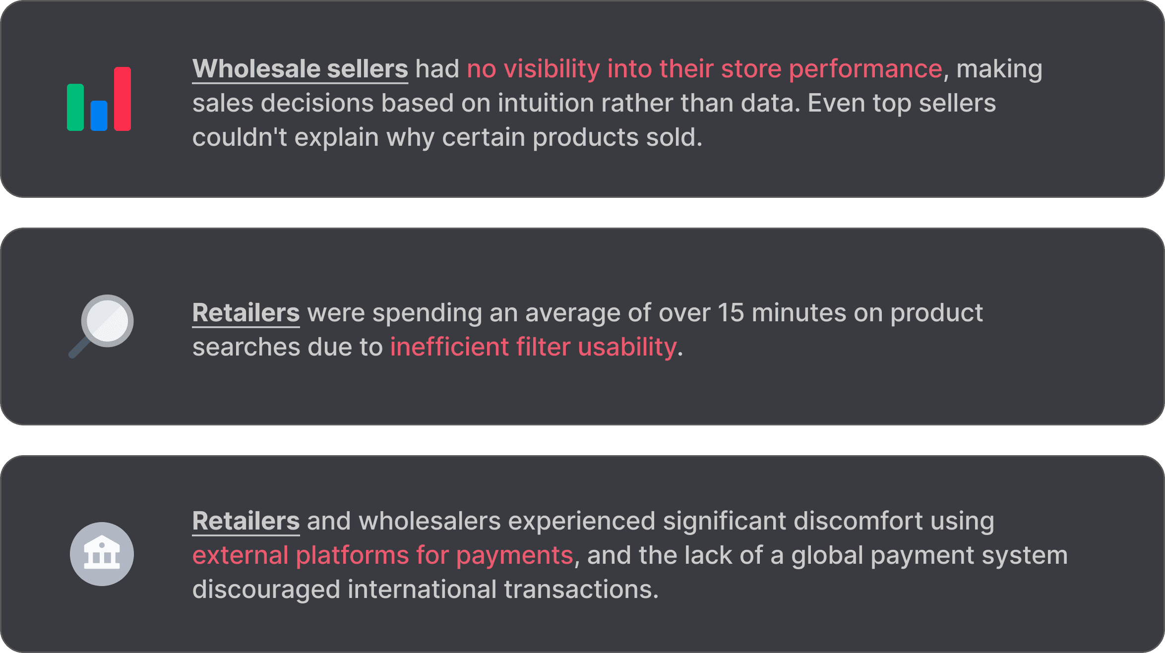 2. Limited visibility into store performance for wholesalers ~400K products registered, but only ~10% actually selling. Most sellers made decisions based on intuition. Even top sellers said, "I don't really know why this one sells."