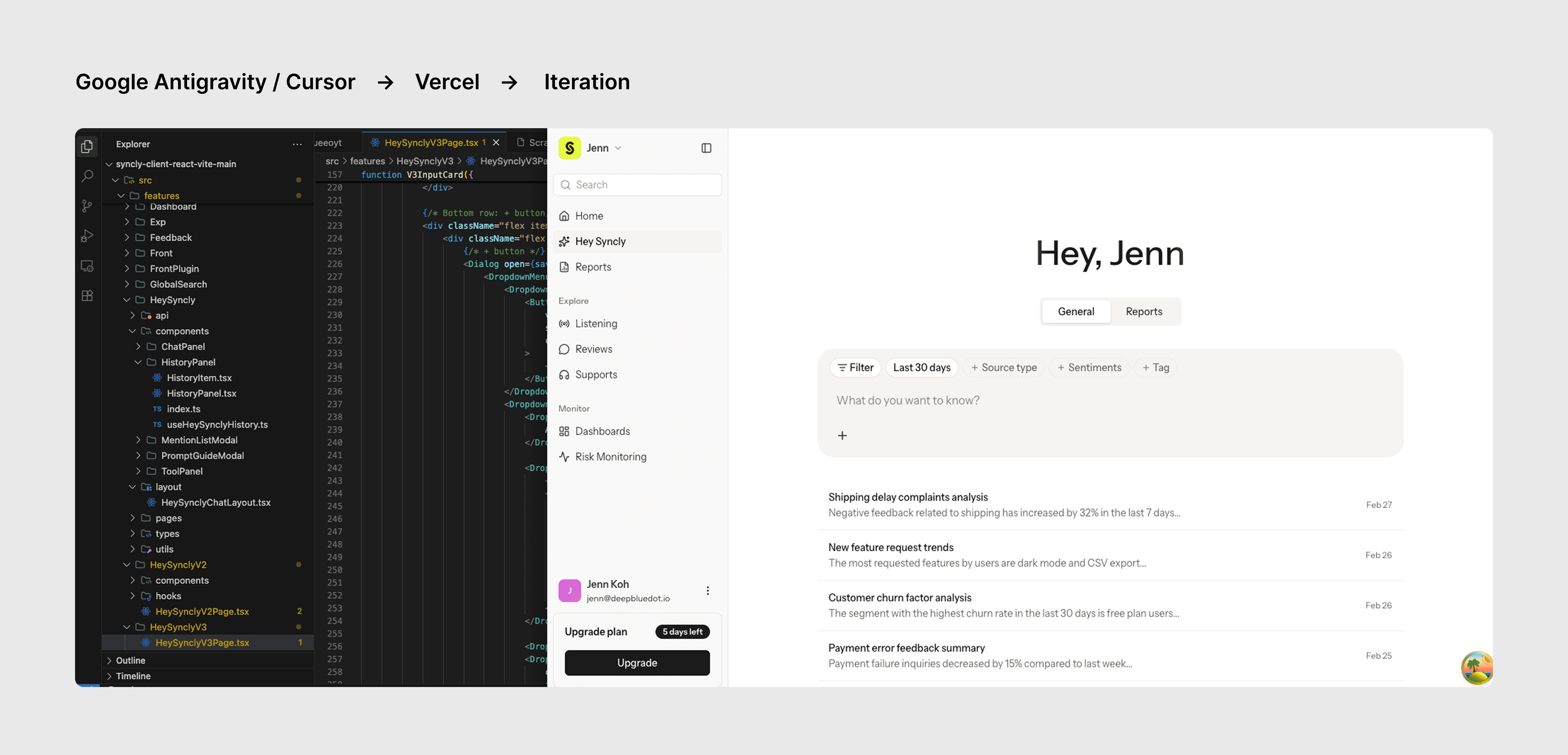 Figma → Google Antigravity / Cursor (Claude Code) → Vercel → Customer interviews & testing → repeat.