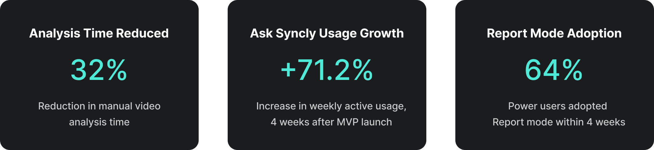 Four weeks after MVP launch, the redesigned Ask Syncly reversed the usage drop that triggered this project. Weekly active usage grew 71.2%, driven by preset questions that lowered the barrier to start and a video-tailored answer structure that gave users a reason to stay.